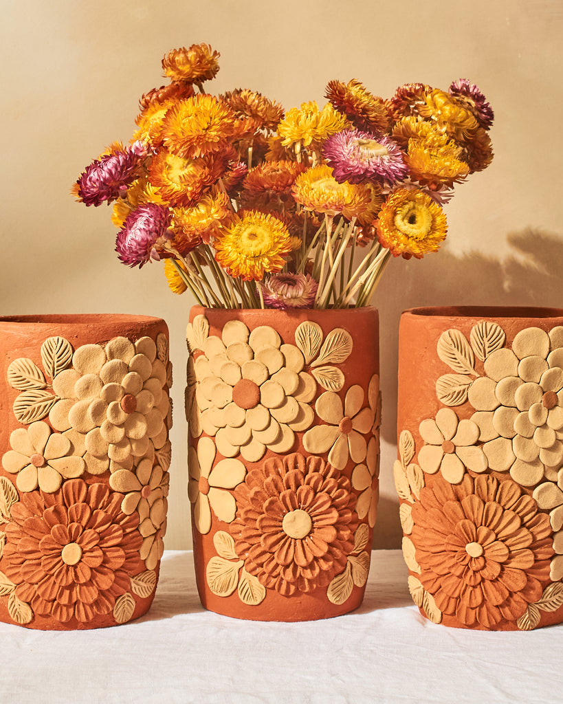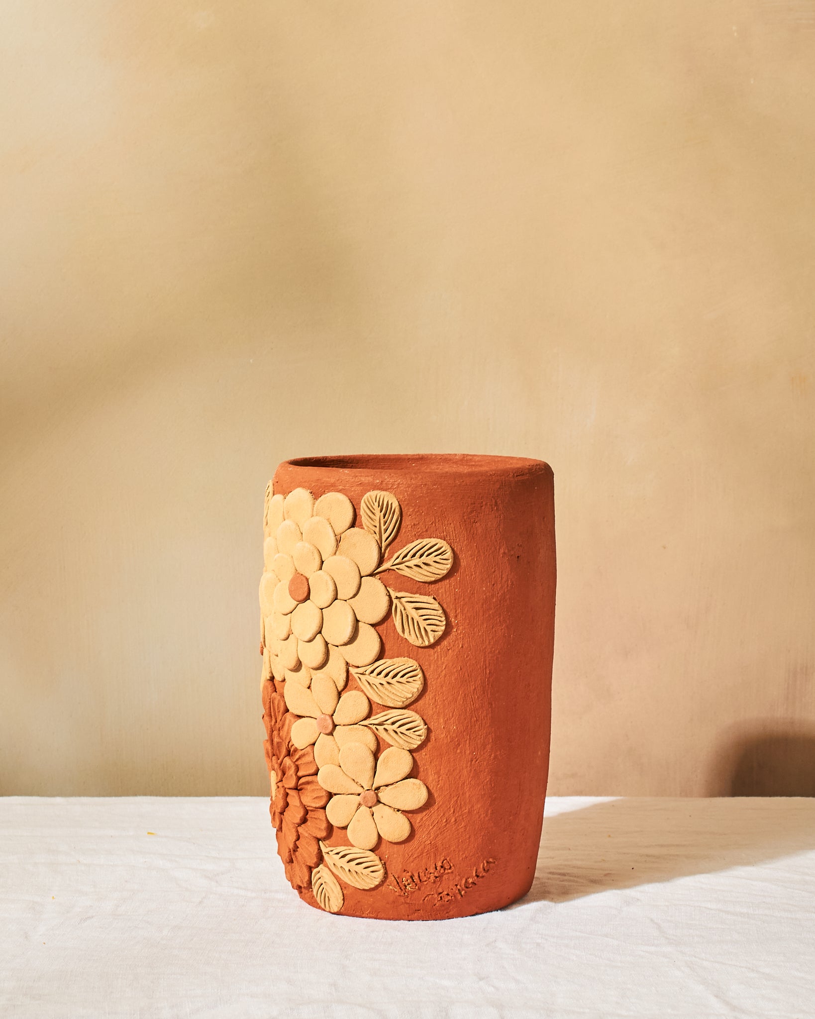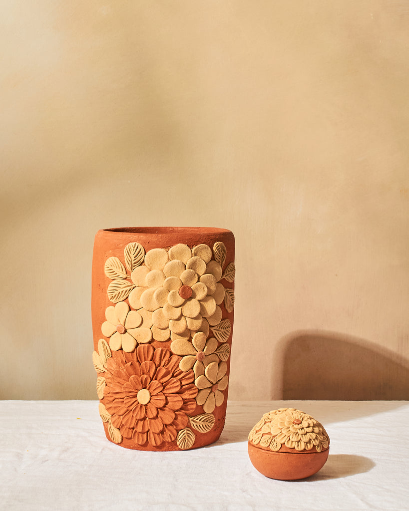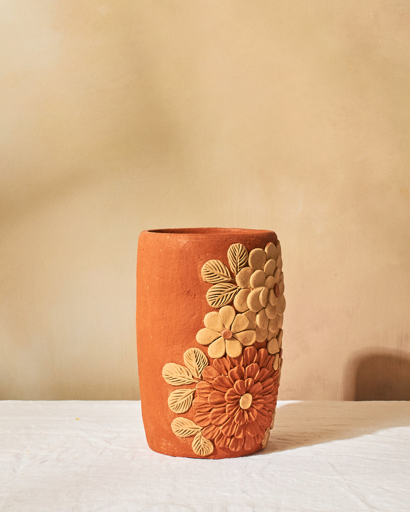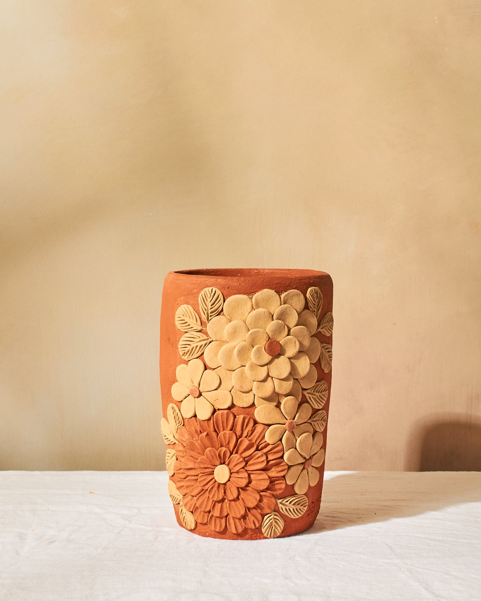 Bring a beautiful piece of Oaxacan craft into your home with this vibrant terracotta vase, meticulously handcrafted by the renowned Velasco family of artisans in the village of Santa María Atzompa. The gorgeous, three-dimensional floral design is made using the specialized filigrana de barro technique traditional to Santa María Atzompa. A truly special representation of Oaxacan heritage!