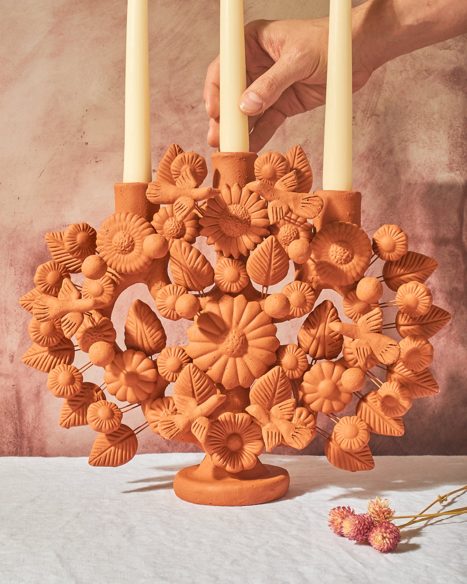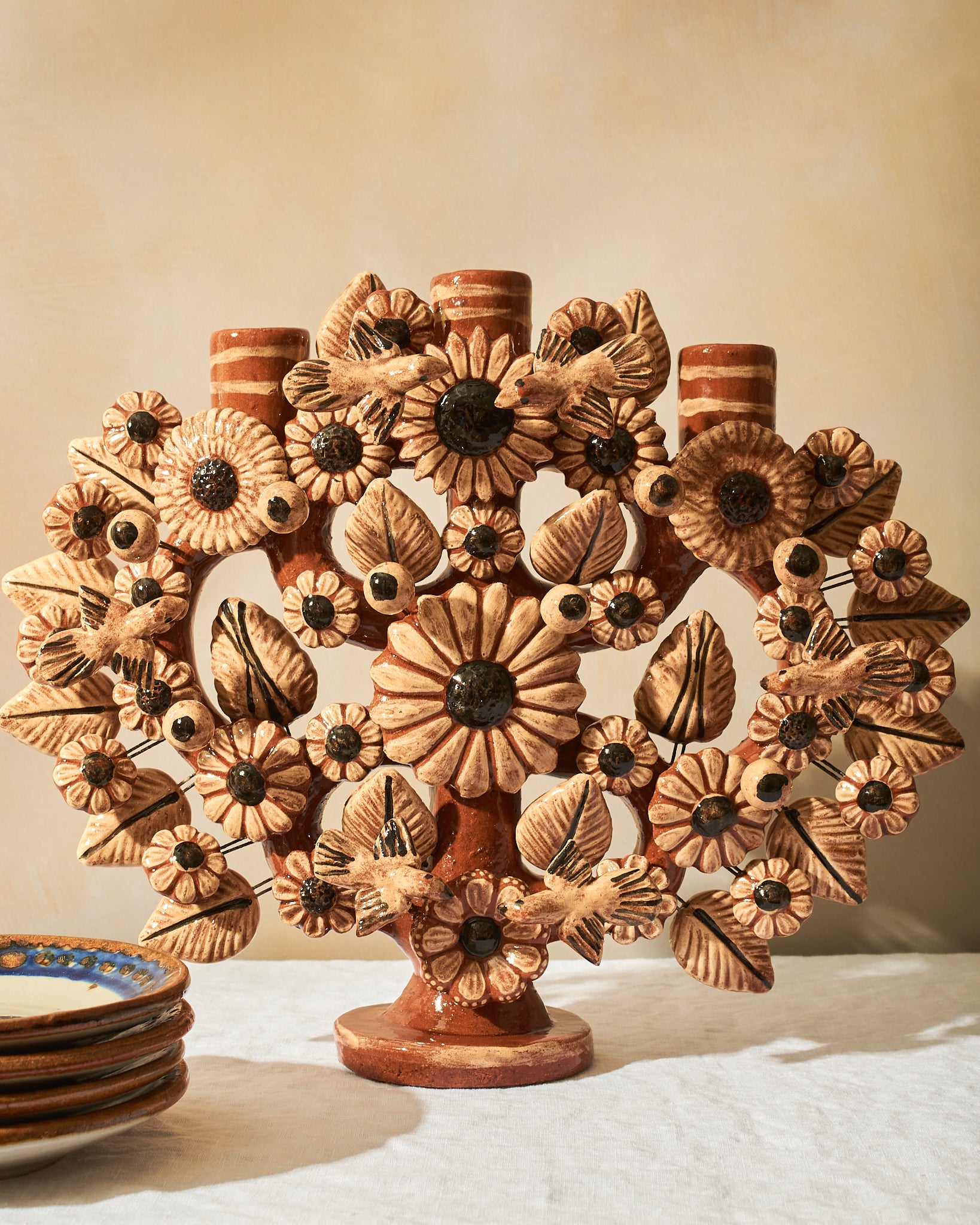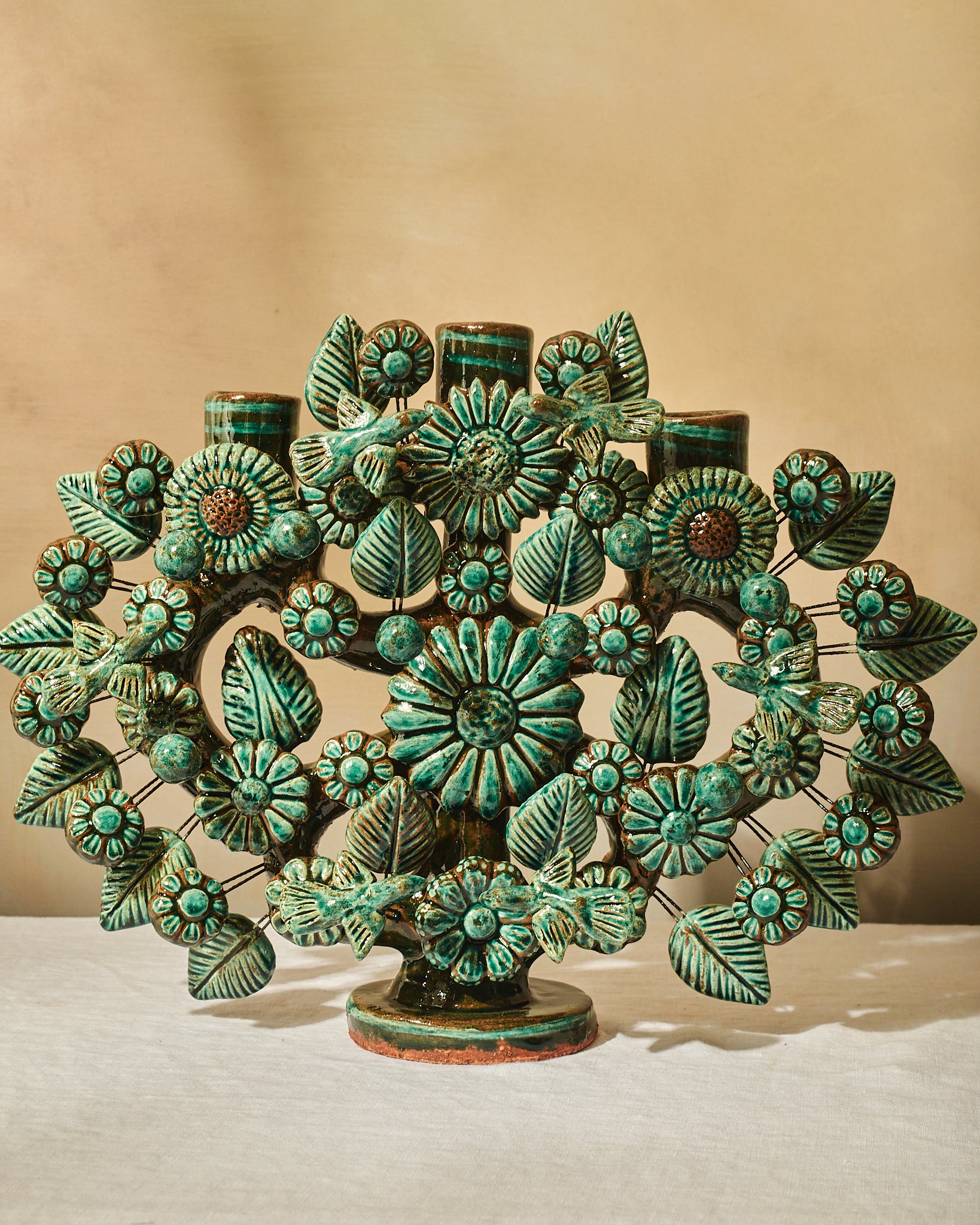 Hand-sculpted in the historic workshops of Metepec, State of México, this intricate piece is a testament to the Artesanías Montoya family legacy. Each miniature flower, leaf, and blossom is molded by hand from raw clay and fired in traditional kilns before being meticulously hand-glazed. Traditionally used to tell stories of creation and lineage, our curated Árbol balances vibrant folk-art tradition with a sophisticated silhouette that commands attention on a minimalist mantle or a layered dining landscape.