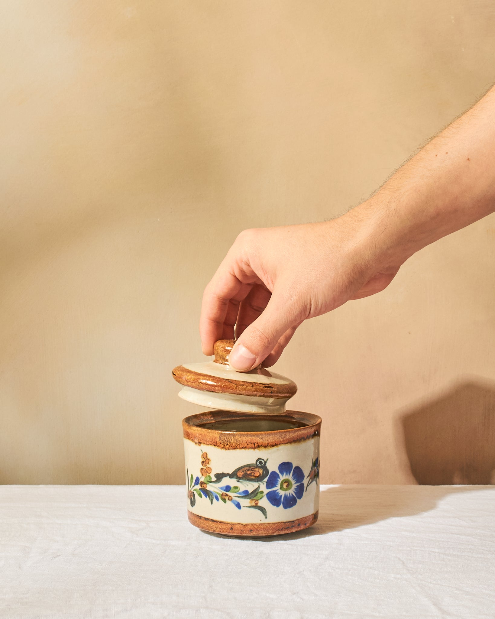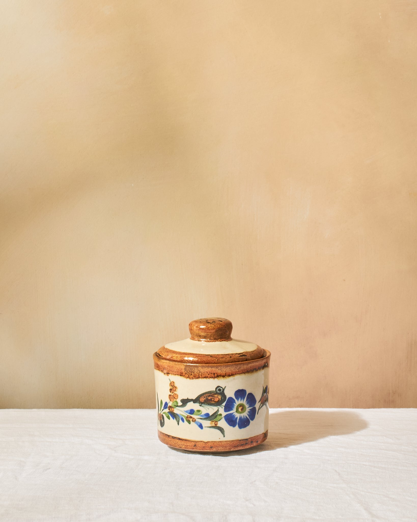 This sweet jar, hand-painted with a charming flower and bird motif will bring a touch of Tonalá warmth to your kitchen or table. Perfect for storing sugar, tea bags, or small countertop essentials, or simply use it as a cheerful piece of hand-painted decor.