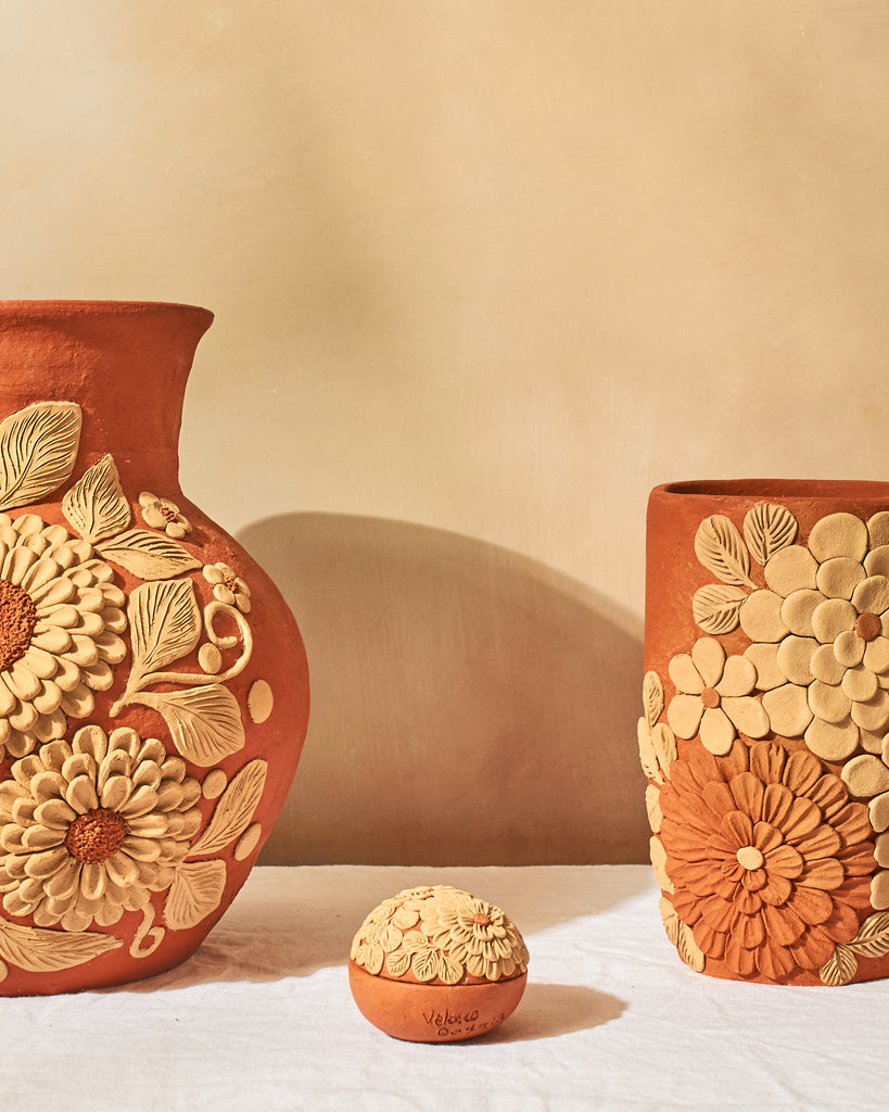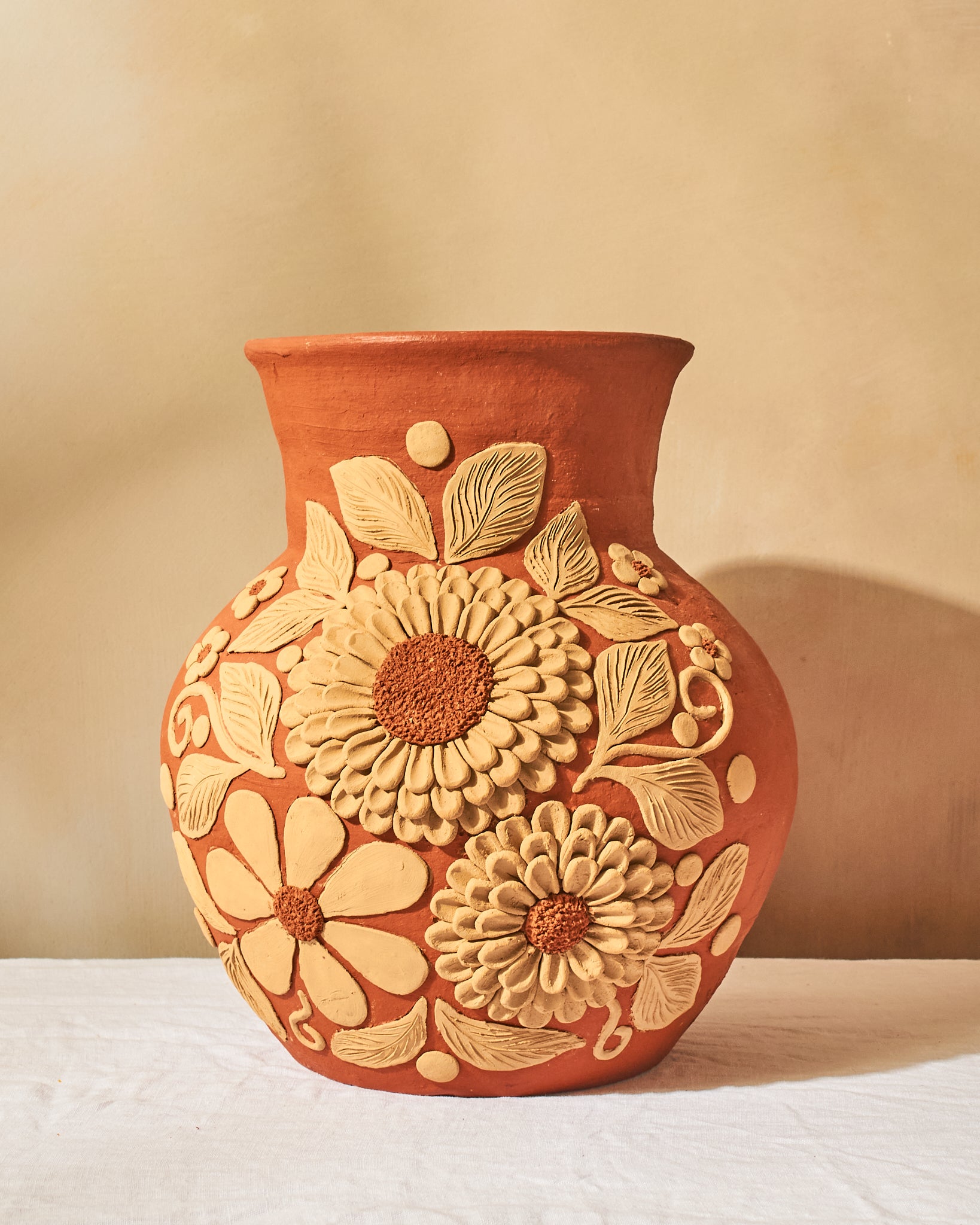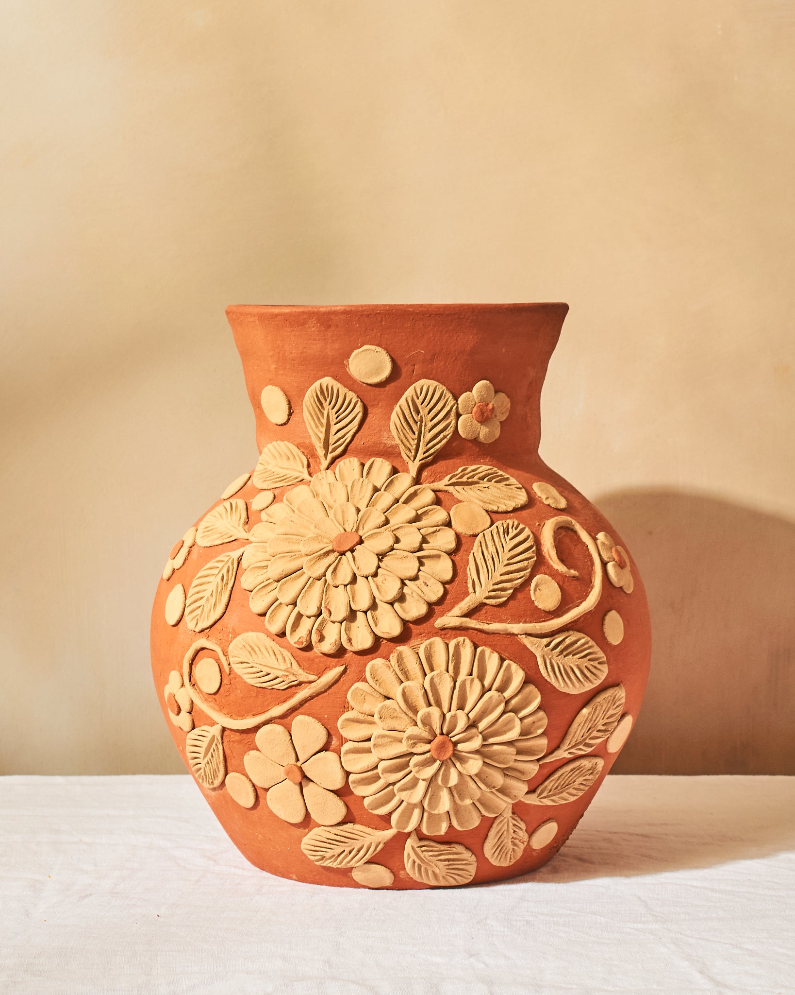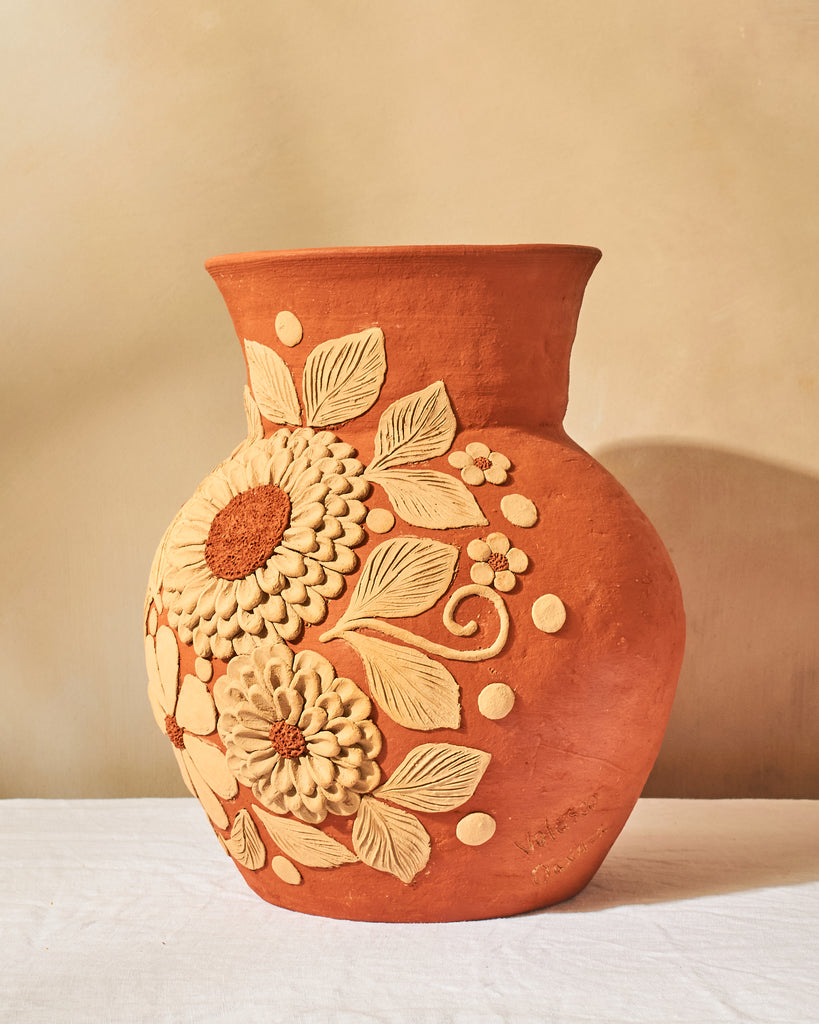 Bring a beautiful piece of Oaxacan craft into your home with this stunning, large-scale terracotta vase, meticulously handcrafted by the renowned Velasco family of artisans in the village of Santa María Atzompa. The gorgeous, three-dimensional floral design is made using the specialized filigrana de barro technique traditional to Santa María Atzompa. An incredible representation of Oaxacan heritage!